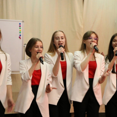 К поздравлениям присоединились вокальные коллективы "Конфетти" Центр развития творчества детей и юношества "Радуга" и "Соловей" гимназия №1 г.Воронежа.