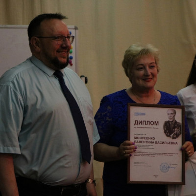Валентина Васильевна Моисеенко - руководитель школьного музея «История села» МКОУ «Мужичанская СОШ» награждена Дипломом имени Александра Ивановича Гринько в номинации «Лучший руководитель музея исторического профиля образовательной организации Воронежской области за увековечивание памяти погибших защитников Отечества» и памятным подарком.