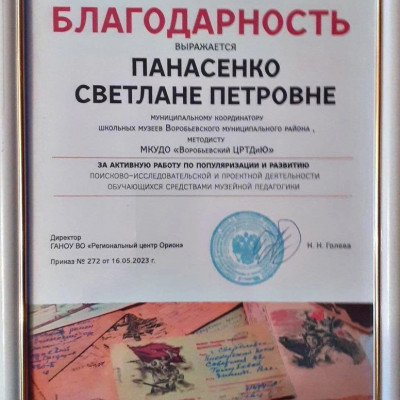Муниципальный координатор школьных музеев, методист МКУДО «Воробьевский ЦРТДиЮ» С.П.Панасенко отмечена Благодарностью за активную работу по популяризации и развитию поисково-исследовательской и проектной деятельности обучающихся средствами музейной педагогики.