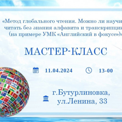 Обособленное подразделение ВИРО им. Н.Ф. Бунакова в Бутурлиновском муниципальном районе Воронежской области 11 апреля проводил мастер-класс «Метод глобального чтения. Можно ли научить читать без знаний алфавита и транскрипции (на примере УМК «Английский в фокусе»)».