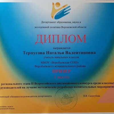 5 октября 2021 года в г. Воронеж прошла торжественная церемония награждения победителей регионального этапа II Всероссийского дистанционного конкурса среди классных руководителей на лучшие методические разработки воспитательных мероприятий. Из 44 участников конкурса первое место в области заняла Терпугова Наталья Валентиновна учитель начальных классов МКОУ "Воробьевская СОШ".