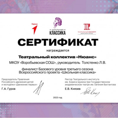 Воробьёвский школьный театр «Нюанс», руководитель Людмила Толстенко, стал финалистом базового уровня третьего сезона Всероссийского проекта «Школьная классика».