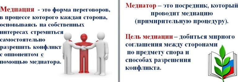 Медиация — это способ урегулирования споров при содействии медиатора (независимое лицо или лица, привлекаемые сторонами в качестве посредников в урегулировании спора для содействия в выработке сторонами решения по существу спора) на основе добровольного участия в целях достижения ими взаимоприемлемого решения.